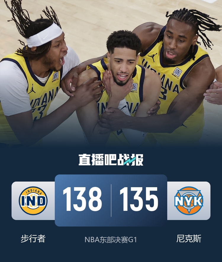 比赛开始,步行者上来反客为主前9投全中,但尼克斯首发五虎也能内外开花强势回应,双方大打对攻战,特纳一个不丢,尼克斯后来居上反超2分,次节双方继续对飙,比分交替领先,尼克斯连续三分命中一波13-1攻击波取得领先,但哈利伯顿有攻有传强势带队止血,布伦森杀伤内线带队半场领先7分。下半场,双方继续拉锯战,尼克斯保持两球以上领先,布伦森和哈利伯顿互相对飙,步行者全民皆兵始终咬住比分,末节布伦森上来就5犯被换下,但尼克斯多点开花轰出14-0再次拉开比分,西亚卡姆止血但唐斯里突外投还能回应,内史密斯3分钟内连中5记三分追到差2分,唐斯关键两罚中一,双方进入“点球”大战,阿努诺比两罚再丢一,哈利伯顿超难后撤步踩线长两分压哨弹进拖入加时。加时赛,步行者进攻断电,唐斯和阿努诺比相继取分,内姆哈德关键三分加上篮反超,比赛更加白热化,比分交替领先,托平折叠扣篮领先3分,布伦森和唐斯接连绝平三分不中,最终步行者加时138-135逆转尼克斯,大比分1-0领先。