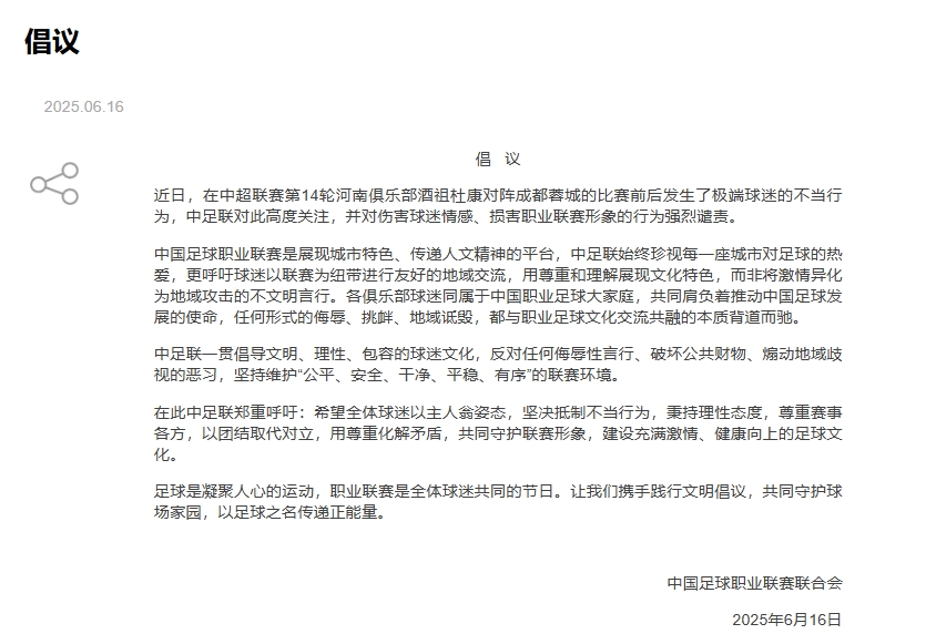 在此中足联郑重呼吁:希望全体球迷以主人翁姿态,坚决抵制不当行为,秉持理性态度,尊重赛事各方,以团结取代对立,用尊重化解矛盾,共同守护联赛形象,建设充满激情、健康向上的足球文化。
