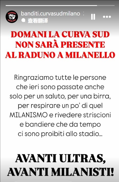 声明中写道:“明天我们不会在米兰内洛的季前首训时集结。我们感谢昨天(在南看台年终聚会上)所有来访的朋友,不管是来打个招呼、喝杯啤酒,还是为了感受那份‘米兰主义’,并重新看到那些早已在球场被禁止的横幅和旗帜……向前走,Ultras,向前走,红黑米兰主义者!”