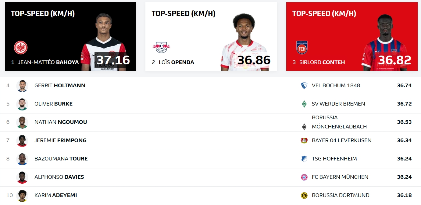 德甲本赛季速度榜显示,弗林蓬的速到达到了36.34km/h,仅次于巴霍亚(法兰克福)、奥蓬达(莱比锡)、孔泰(海登海姆)、霍尔特曼(波鸿)、伯克(不莱梅)、恩古穆(门兴)六人。