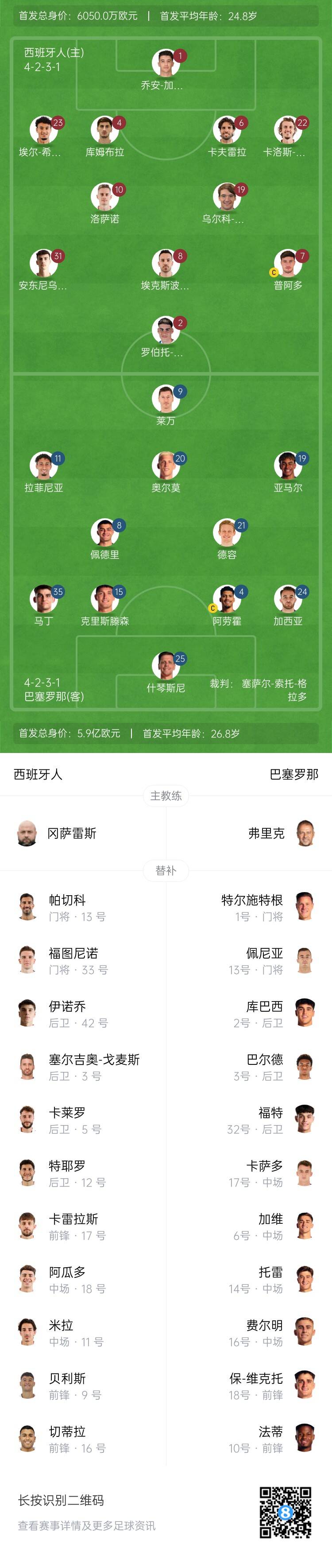 巴萨首发:25-什琴斯尼、4-阿劳霍、15-克里斯滕森、24-埃里克-加西亚、35-杰拉德-马丁、21-德容、8-佩德里、20-奥尔莫、11-拉菲尼亚、19-亚马尔、9-莱万