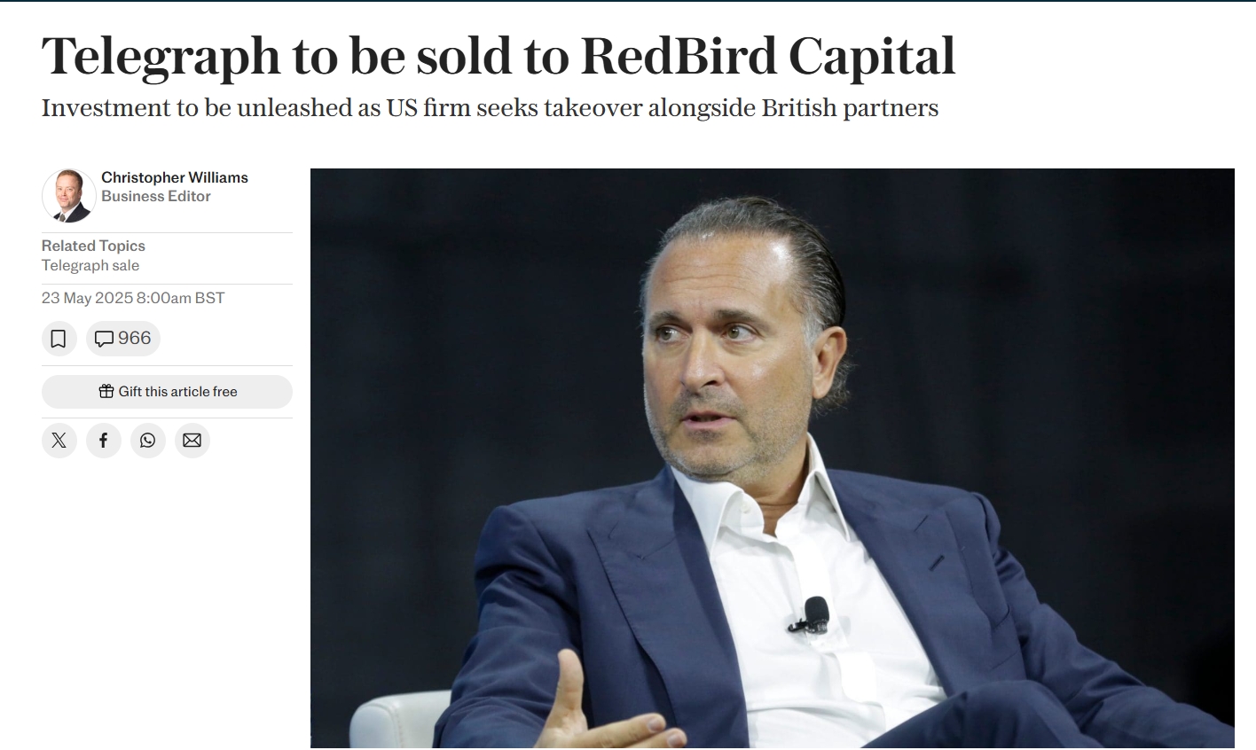 05月24日讯 经过两年动荡期,《每日电讯报》即将迎来转机。根据初步协议,这家英国老牌媒体将被红鸟资本(RedBird Capital Partners)牵...